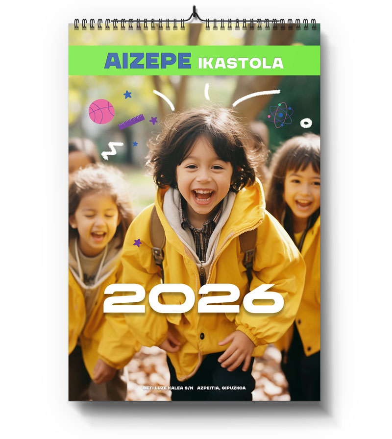 Los calendarios para la ikastola, colegio o escuela se pueden personalizar como se quiera: el logo y los colores corporativos de la escuela. Fechas importantes para los padres, como eventos, fechas señaladas e información sobre el deporte escolar, excursiones y otras actividades.
